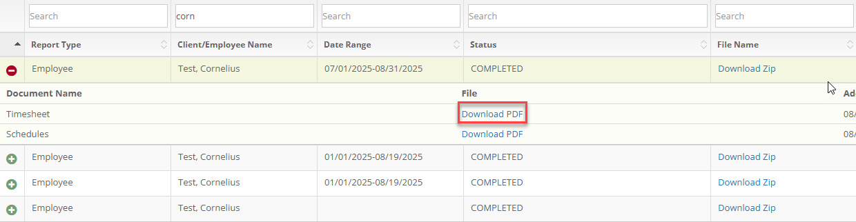 After locating a report, you can download it. To download the entire report, including all forms that were attached to it, please select "Download Zip." This will download a Zip file. Every document type that was selected in the report will receive its own file.