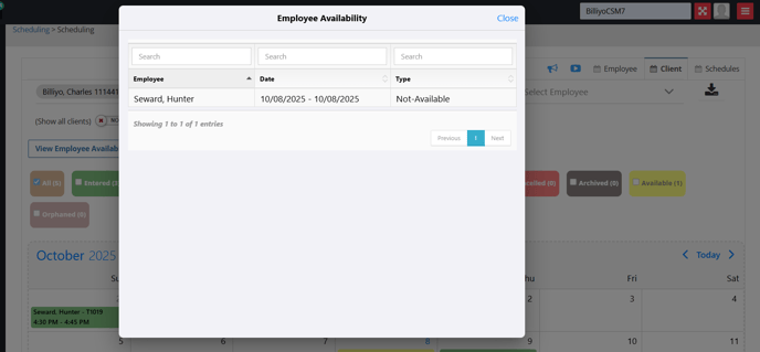 So, if a Caregiver or QP is associated to a Client and they have time off Approved, this will appear in the Client Scheduling Page for the Client that is Assigned to the Employee in the Client Caregiver Connection.
