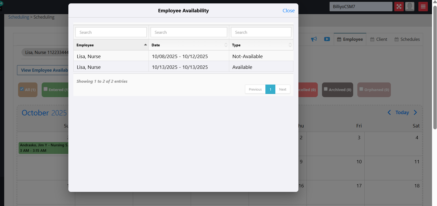 The Employee Availability, if Approved, will also appear in the Employee Scheduling Page for that Employee.