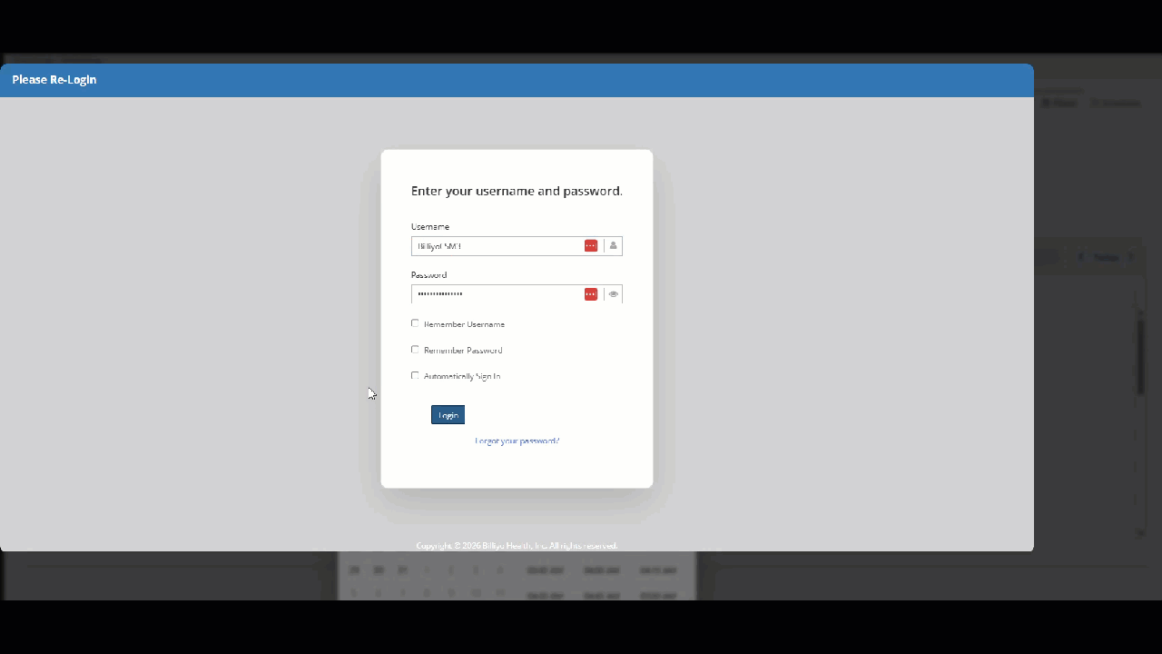 To comply with HIPPA, Billiyo account will automatically log off of Billiyo after 15 minutes of inactivity. To get back into Billiyo, simply renter your user name and password.