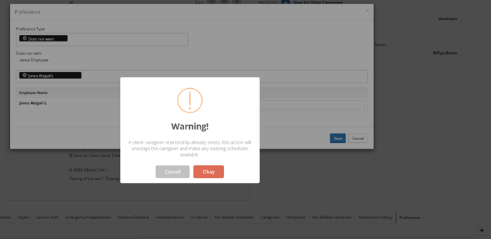 When a new Preference is added but a Client-Caregiver Connection already exists that conflicts with your newly added Preference we will ask for confirmation. If confirmed Yes, we will insert the new Preference record, update the caregiver unassigned date to today’s date, and make available the Schedules previously assigned to the caregiver that is no longer a match, after today's date.