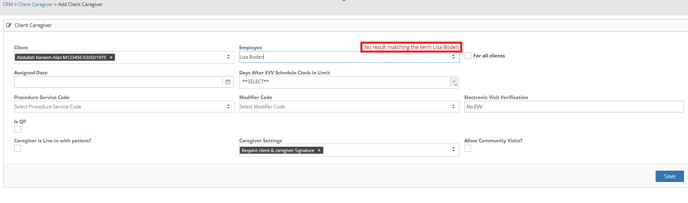 When a Preference exists that does not match the client and employee, you will not be able to search for that employee to be added in the CRM>Client Caregiver>Add Client Caregiver Page.