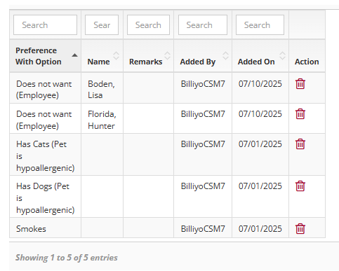 If you have made a Mistake or the Client and Caregiver later become compatible, you can delete the Preference by clicking on the Red Trashcan.