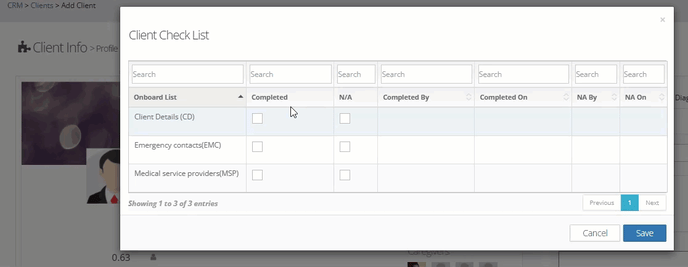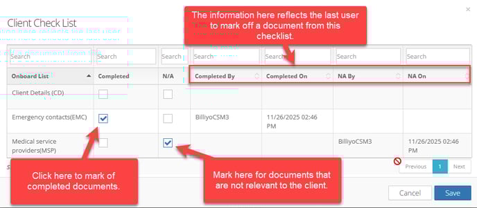 To check documents off of this list, we can click on the check list and then tick off the documents that have been completed. This will remove the document's short code from the top of the client's profile.