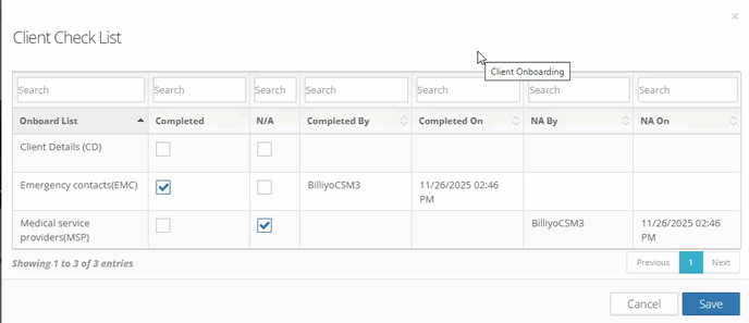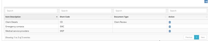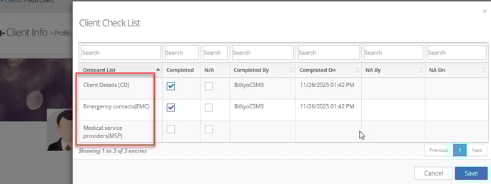 The documents that are marked as "Completed" or "N/A" will dissapear from the client profile.