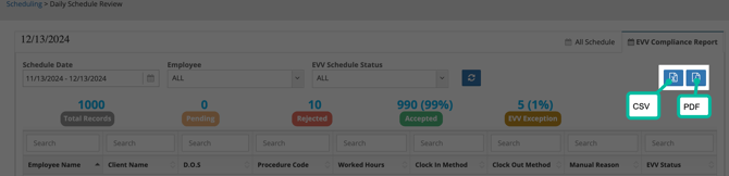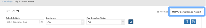 In the upper right hand corner of the Daily Schedule Review page, you'll find a tab for EVV Compliance Report.
