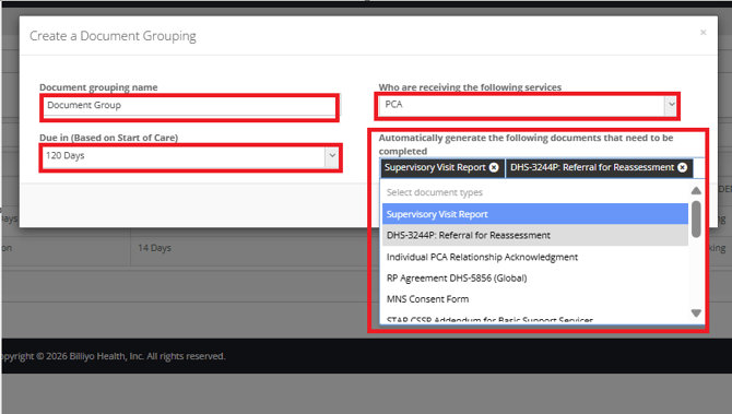With Document Grouping you have the control of creating groups of documents or single documents to be auto generated based on intervals of care.