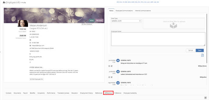 At the bottom of the Employee Profile you will see the Affiliations Tab:
