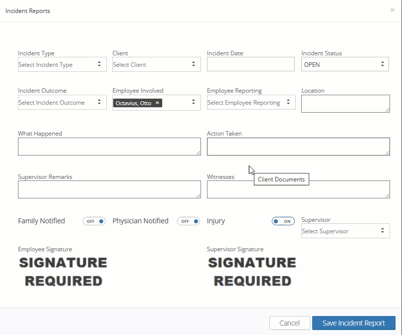 - *Employee Involved - This will autofill with the caregiver's profile.