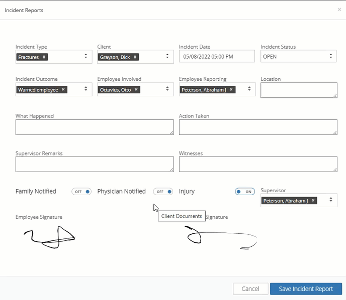 After filling out an incident report, we can save it by hitting the blue "Save Incident Report" button.
