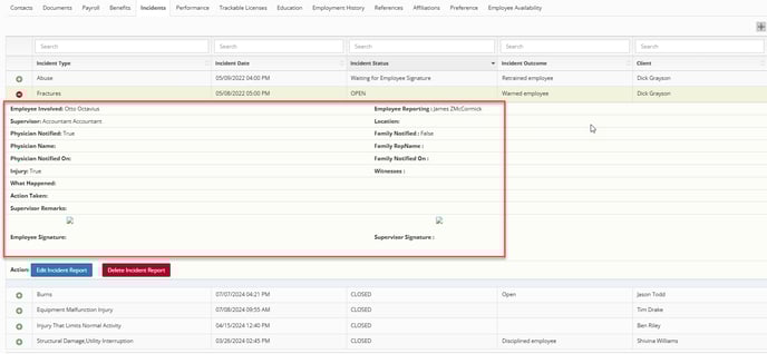 Here, we can see a list of all incident reports that involve our chosen employee.