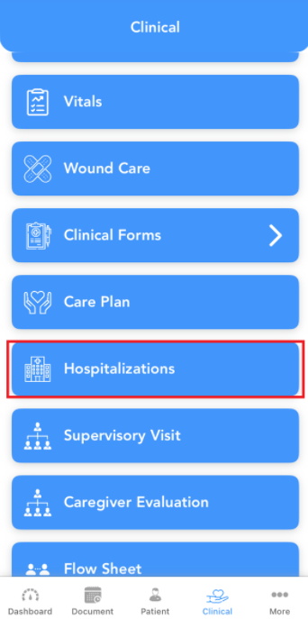 Here you will see any hospitalizations added either by the back office or by the clinical application users.
