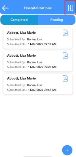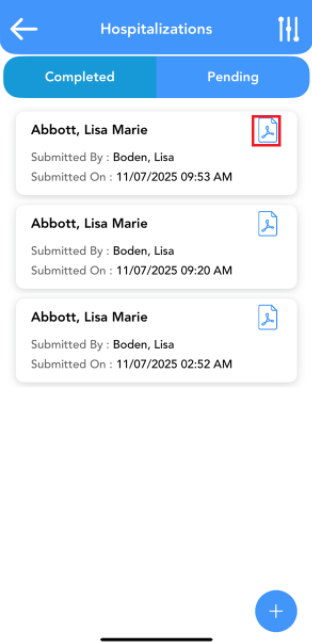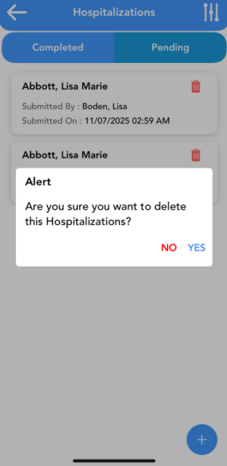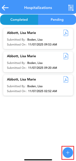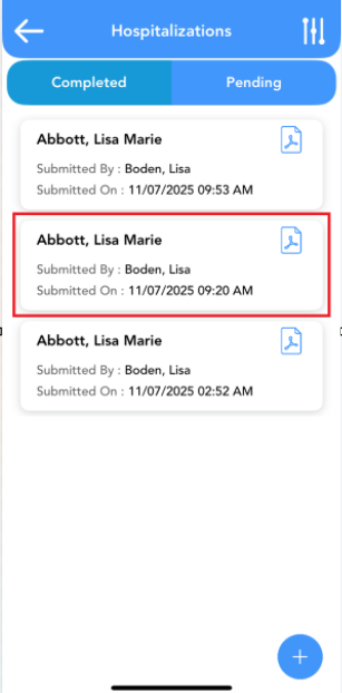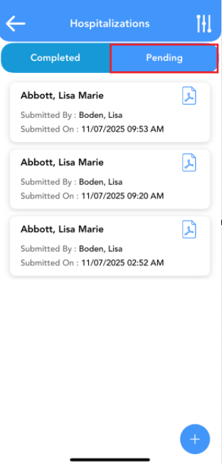 To switch to incomplete or pending hospitalizations, click on the pending tab.