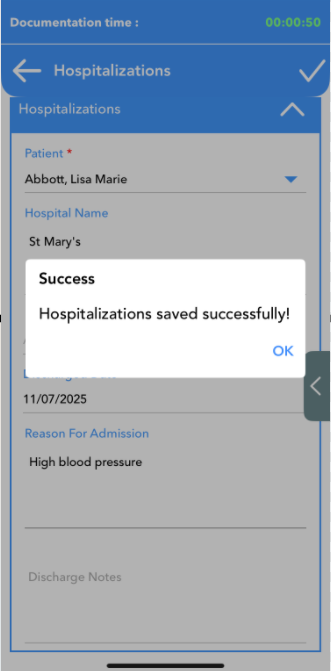 Once submitted you will get a success message and the record will be synced to the back office and remain a part of the patient chart.