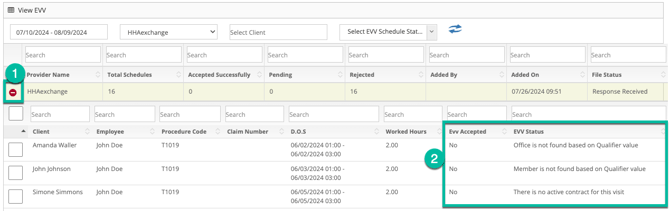 As you review submitted EVV visits, it will be important to pay attention to the EVV Accepted and EVV Status columns. To see this information, click on the + sign to the left of each line item.