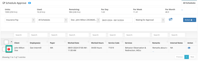 Once the table has refreshed, all worked visits for the client in the date range selected should appear. Visits that need review will be marked with an ! indicator. Hover your mouse over the indicator to learn more.