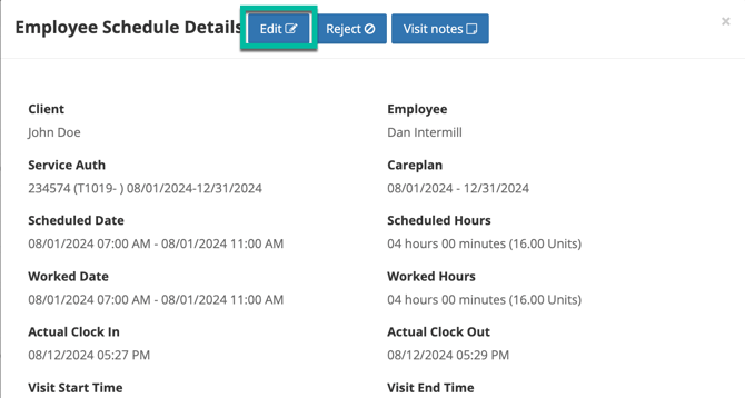 Before editing, the already captured visit information will appear. On this screen, the Billiyo Reason that the caregiver selected at the time of clock in or out within their Billiyo app will also be displayed.