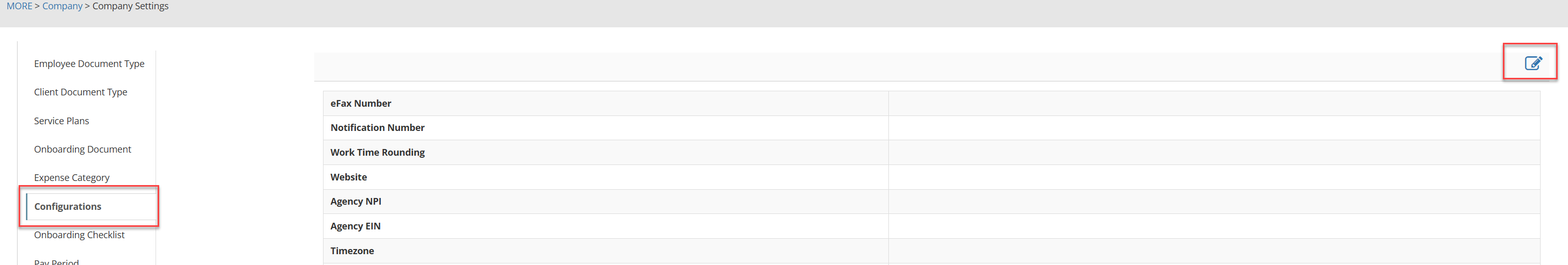 Once in Company Settings, select the Configuration tab. To edit configurations, click on the Pen and Pad on the top right.