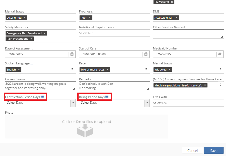 - You can Identify the Certification period and Billing period's here in the Edit Patient Profile as well