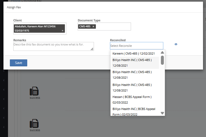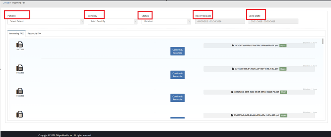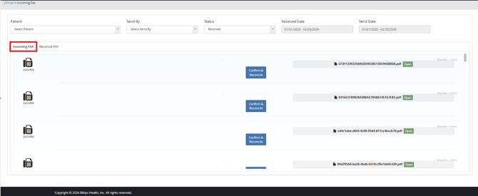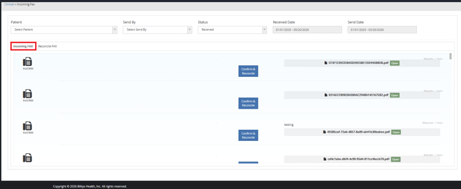 Once a fax is received in Billiyo you will need to confirm and reconcile it in order to get the document received into the patient chart.