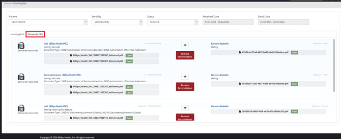 Removing a Reconciliation will put the Fax back into the “Incoming Fax” Tab.