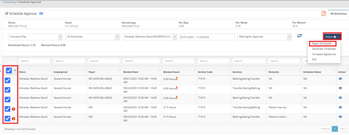 If your caregiver has made a mistake, you can reject a schedule. Rejecting a schedule will get it back into a entered status so that the caregiver can rework the visit or the visit can be canceled.