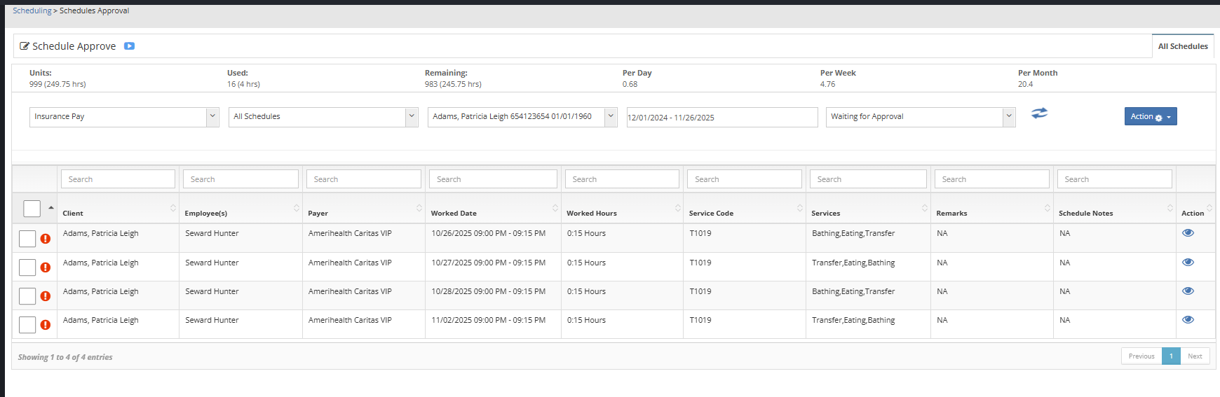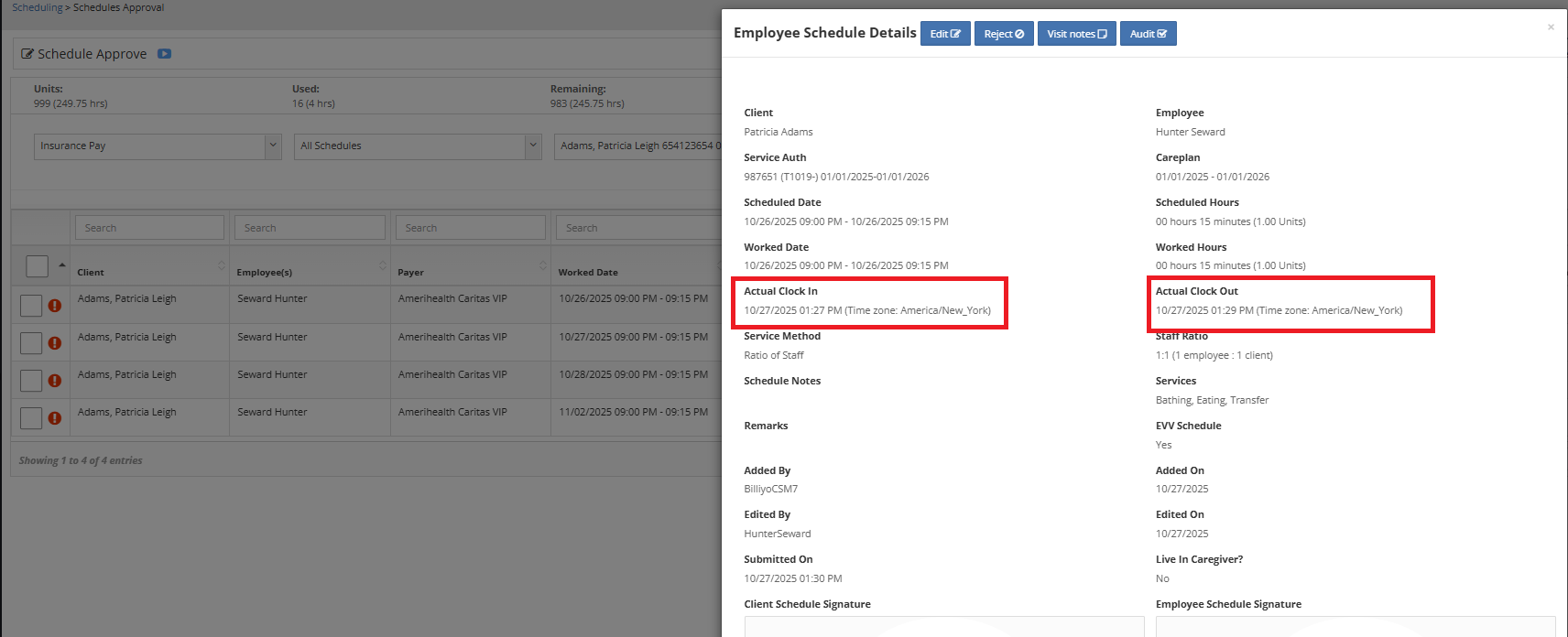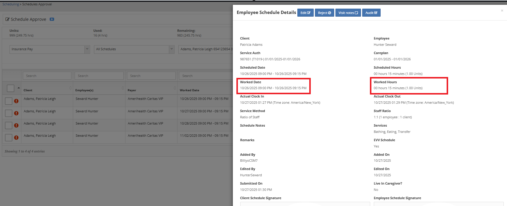 If the visit date and worked date do not match, the schedule approvals page will show a