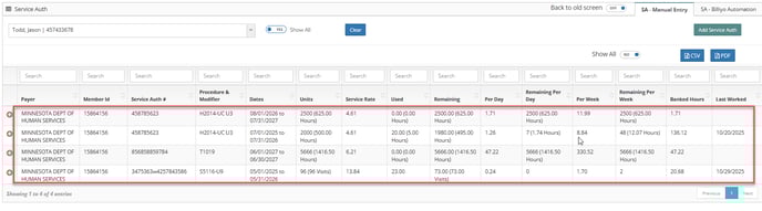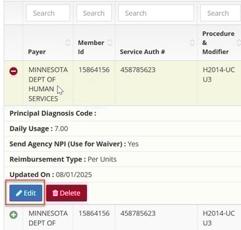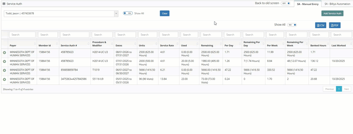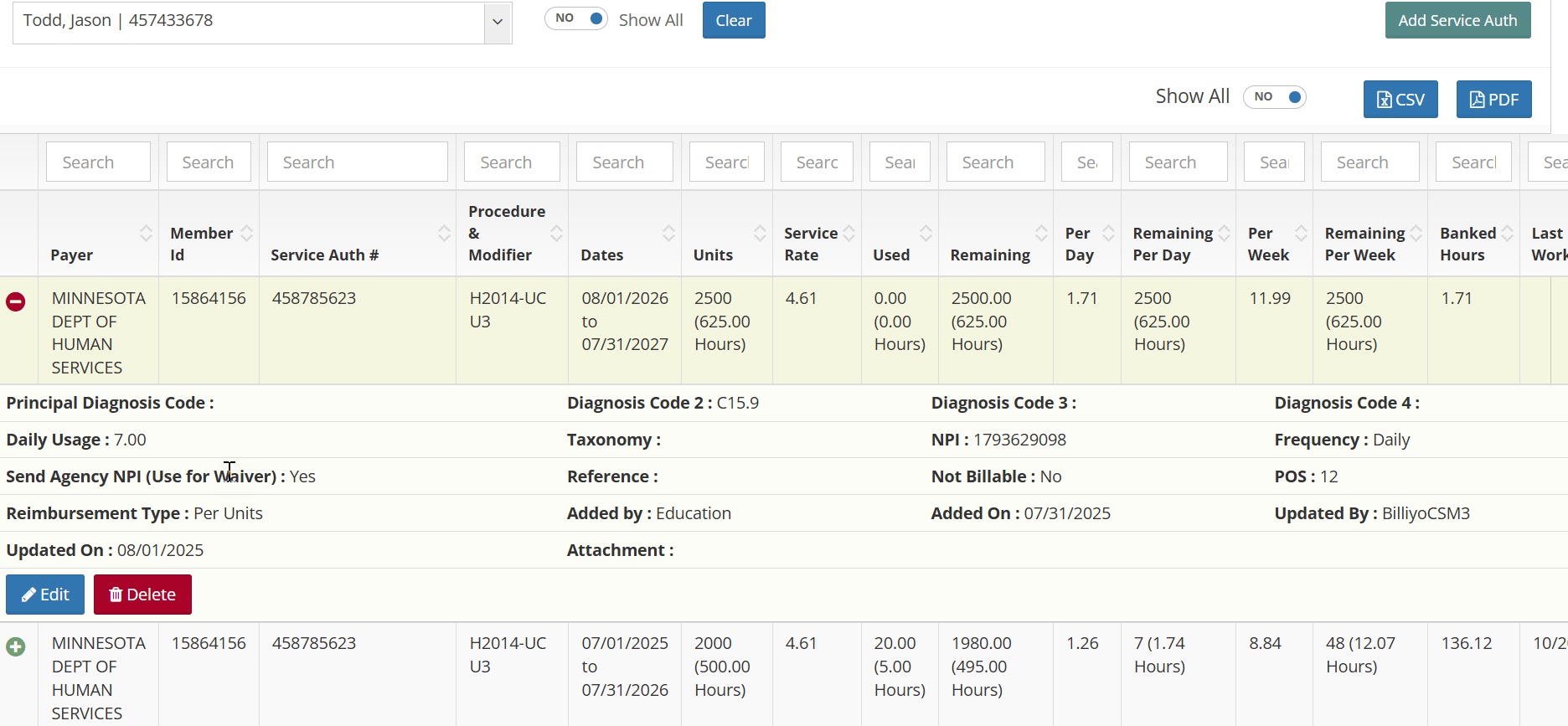 After locating our client, we can see all of their active service agreements. Please keep in mind that if a single service agreement has multiple procedure codes, then each code will receive its own "line."