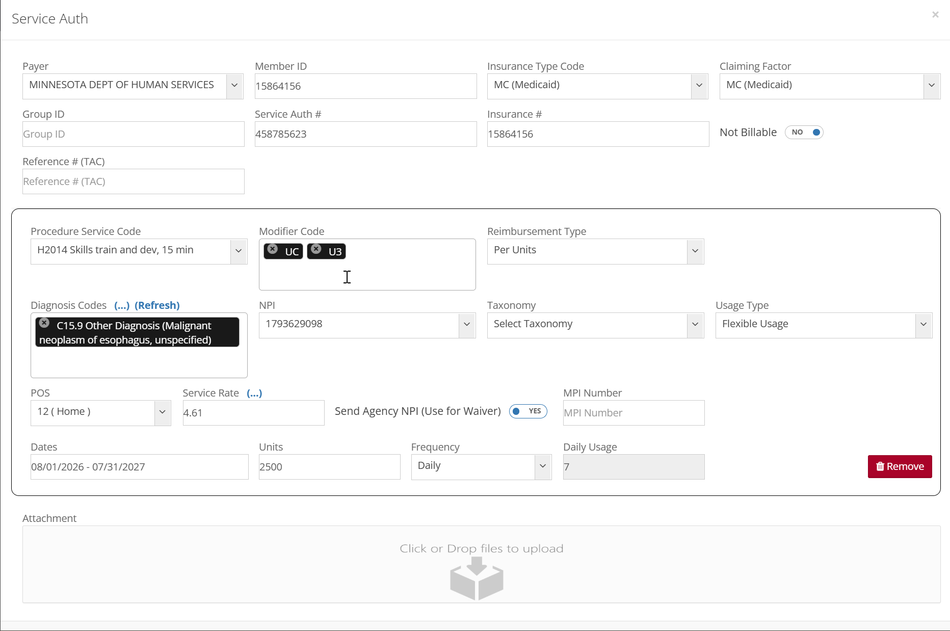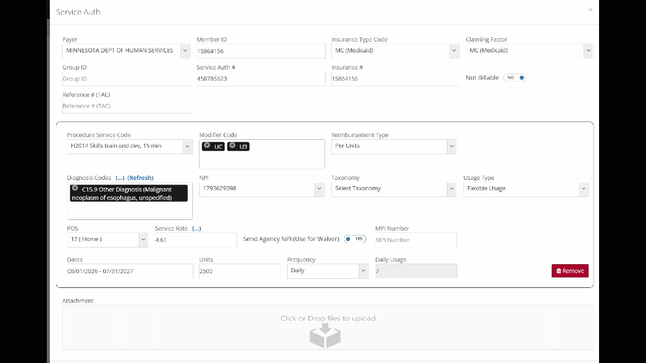 This will bring up a pop-up with with the service authorization information. This field mirrors the pop-up we used when manually entering a service agreement.
