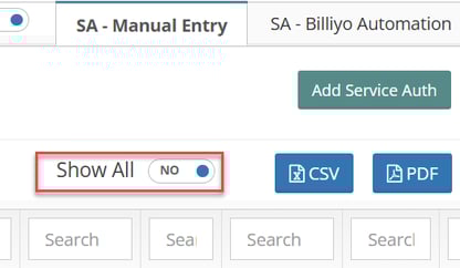 By default, Billiyo will only show "Active" agreements. To see all service authorization, please head to the "Show All" radio on the right side of the page and change it to yes: