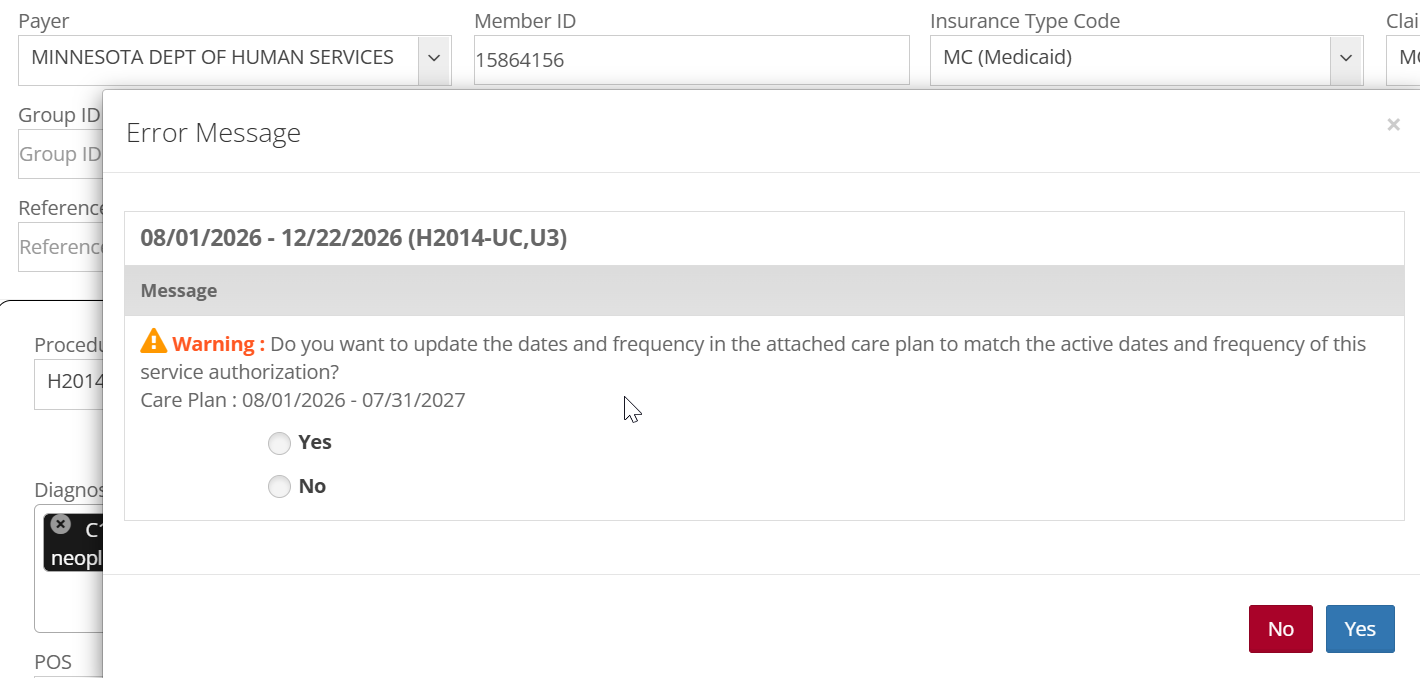 If you are editing the dates of your agreement, you will see a pop up that asks if you want to change the date range of any attached care plan.