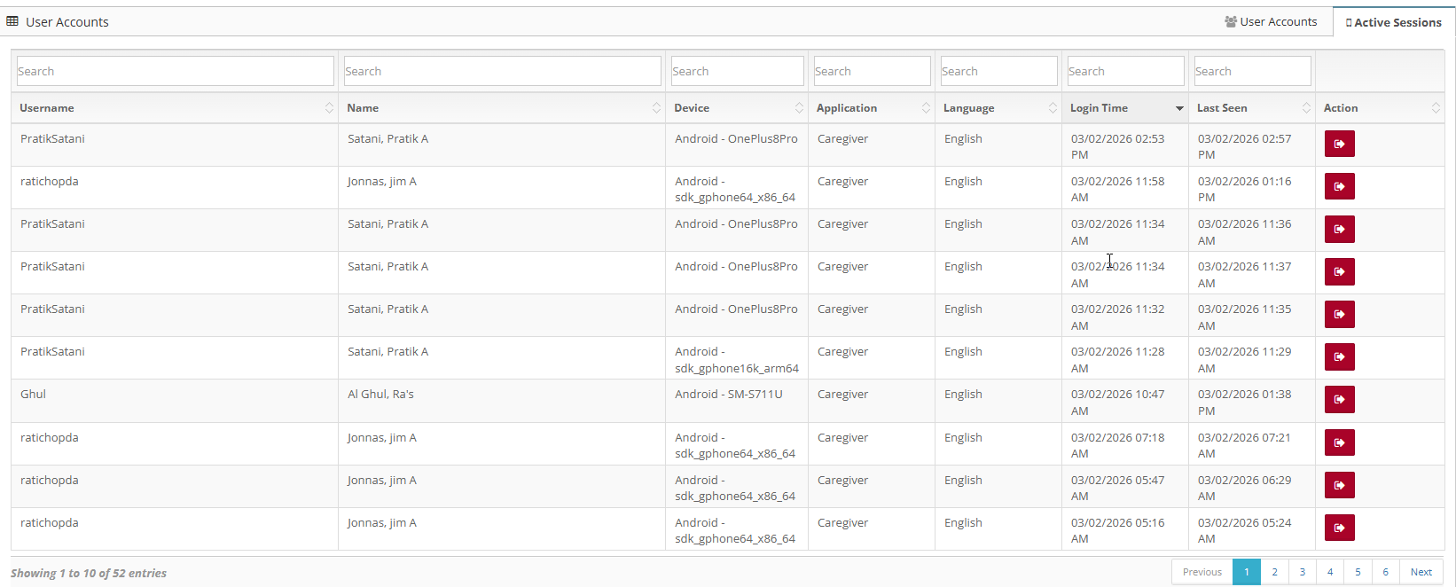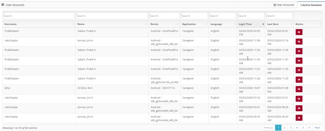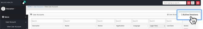 In the Active Sessions tab, we can see the "session" for each user account in Billiyo.