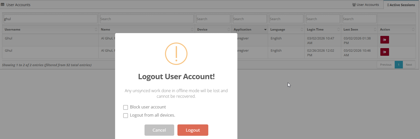 User Account: Active Session and Force Log Out