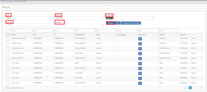 At the top of this page will be several filter fields, use these to help locate a specific fax: