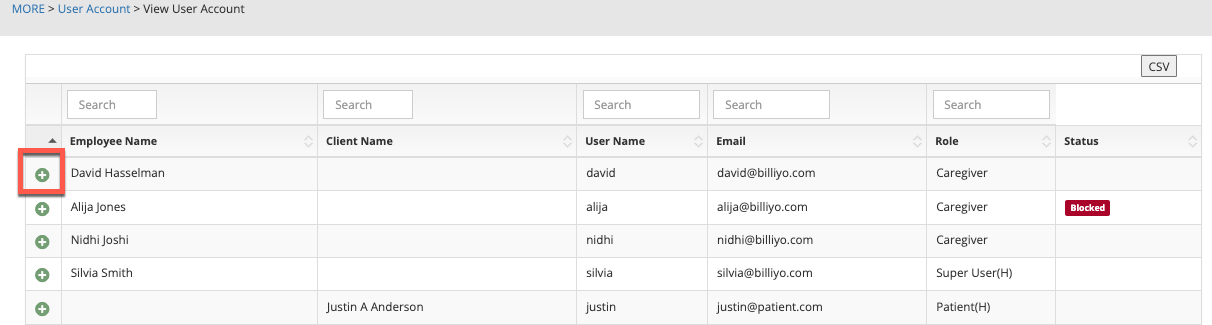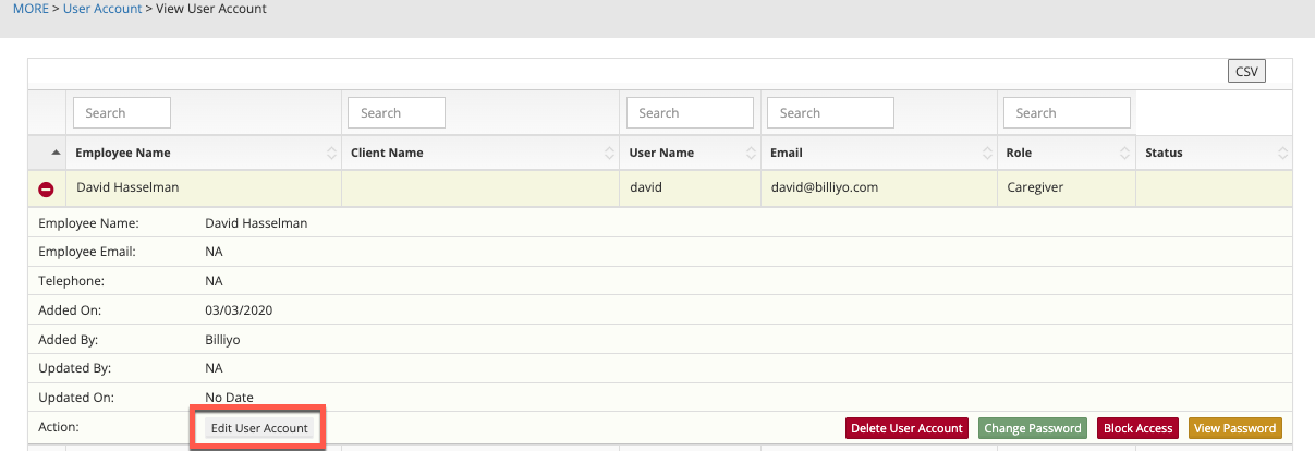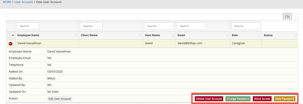 Under the expanded menu the option to delete, block access (or approve access if the account is blocked), view password, and, if the account is for a caregiver, change password will also appear.