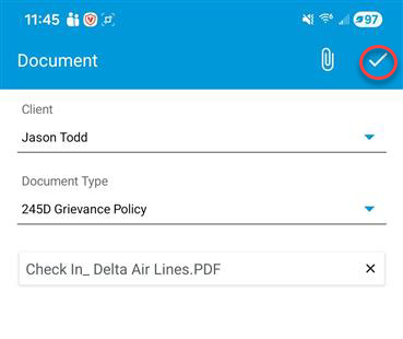 After selecting your document, you can save it to the clients profile bu hitting the white plus sign to the top right of the screen.